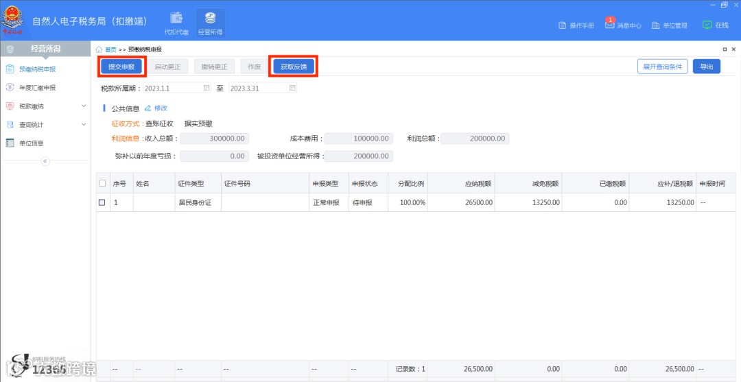 第四步:查看减免税额是否正确,系统自动计算应补/退税额=26500-13250=13250元。确认无误后,点击【提交申报】。等待数秒钟后可点击【获取反馈】,系统提示申报成功即可。