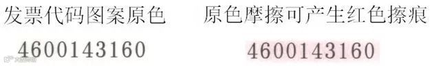 发票各联次左上方的发票代码使用防伪油墨印制,油墨印记在外力摩擦作用下可以发生颜色变化,产生红色擦痕。