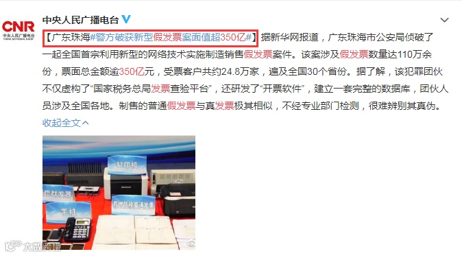 近日,广东珠海市公安局侦破了一起全国首宗利用新型的网络技术实施制造销售假发票案件。经查,此案涉及假发票数量达110万余份,票面总金额约350多亿元,受票客户共约24.8万家,遍及全国30个省份。