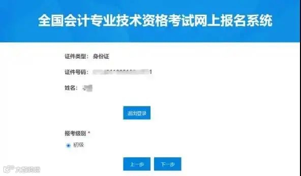 (4)选择报考省份后,点击"下一步",核对证件号和姓名,若与本人不符,可点击"退出登录"按钮,以本人用户名密码重新登录报名。
