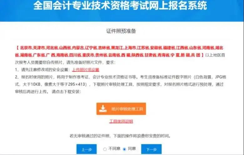 点击上传照片IE设置更改浏览器IE设置,然后下载照片审核处理工具,点击工具使用说明可学习工具使用方法。照片准备完成后,点击"下一步"选择报考省份(每名考生只能选择一个省份),如下图所示。
