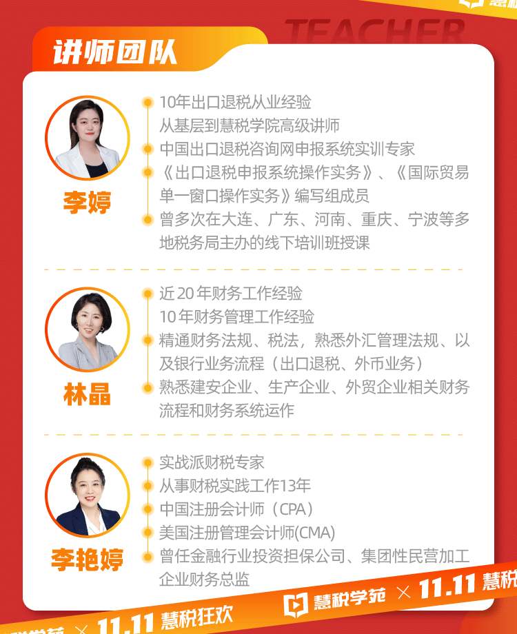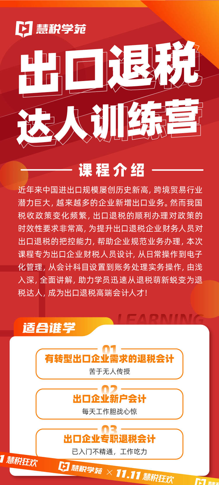 训练营是慧税学苑双十一活动下的一个板块,本次双十一期间,财喵还为大家准备超多活动&惊喜,点击文末“阅读原文”可直接进入双十一主会场!!!