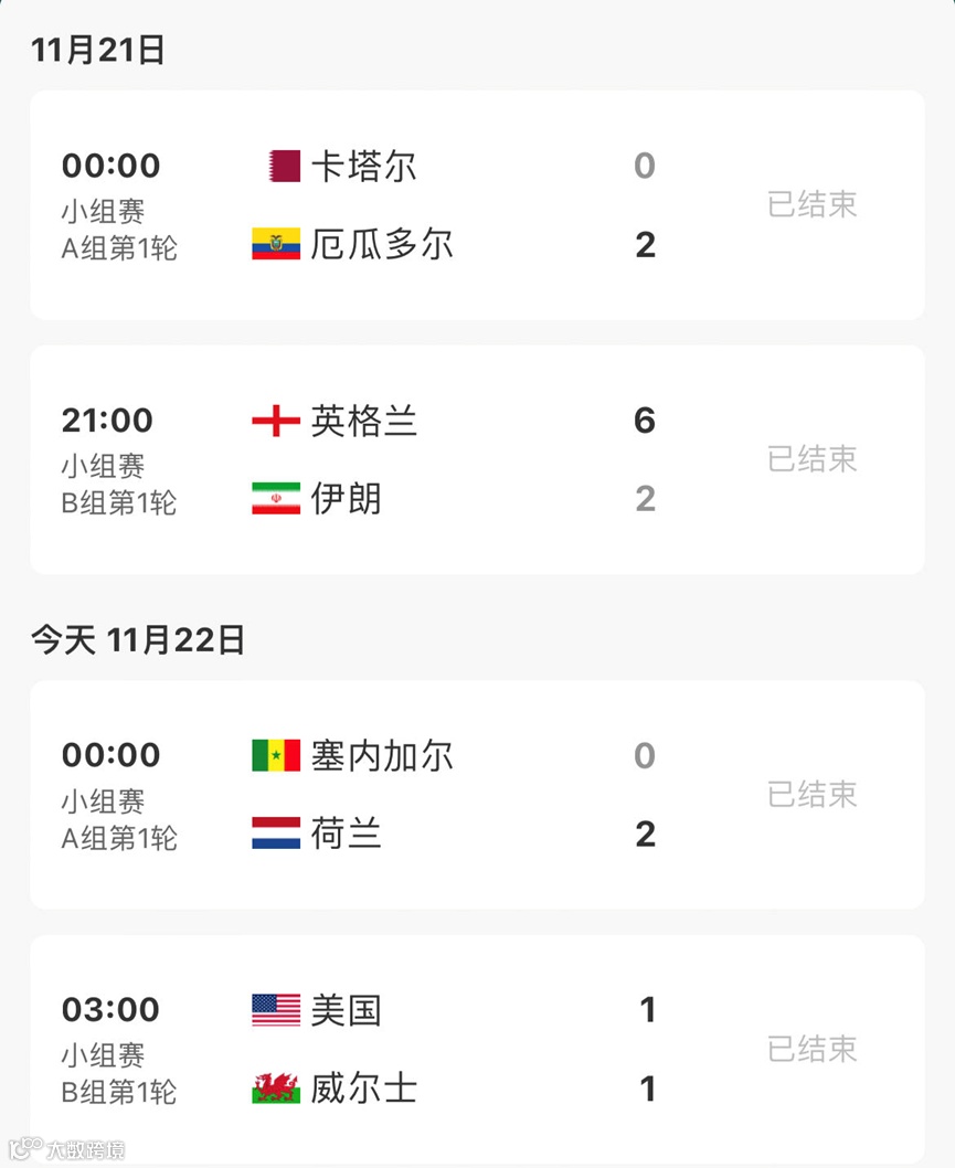 目前卡塔尔世界杯已经完成了四场赛事分别是: