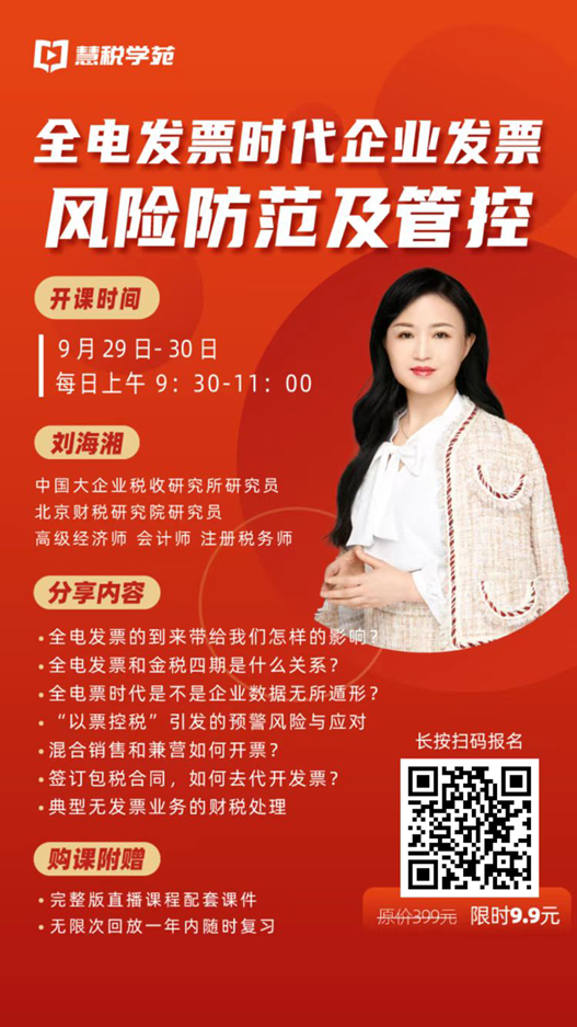 名师在线课堂,经验丰富的刘海湘老师,结合多年税收研究经验讲解全电发票时代企业发票风险防范及管控!