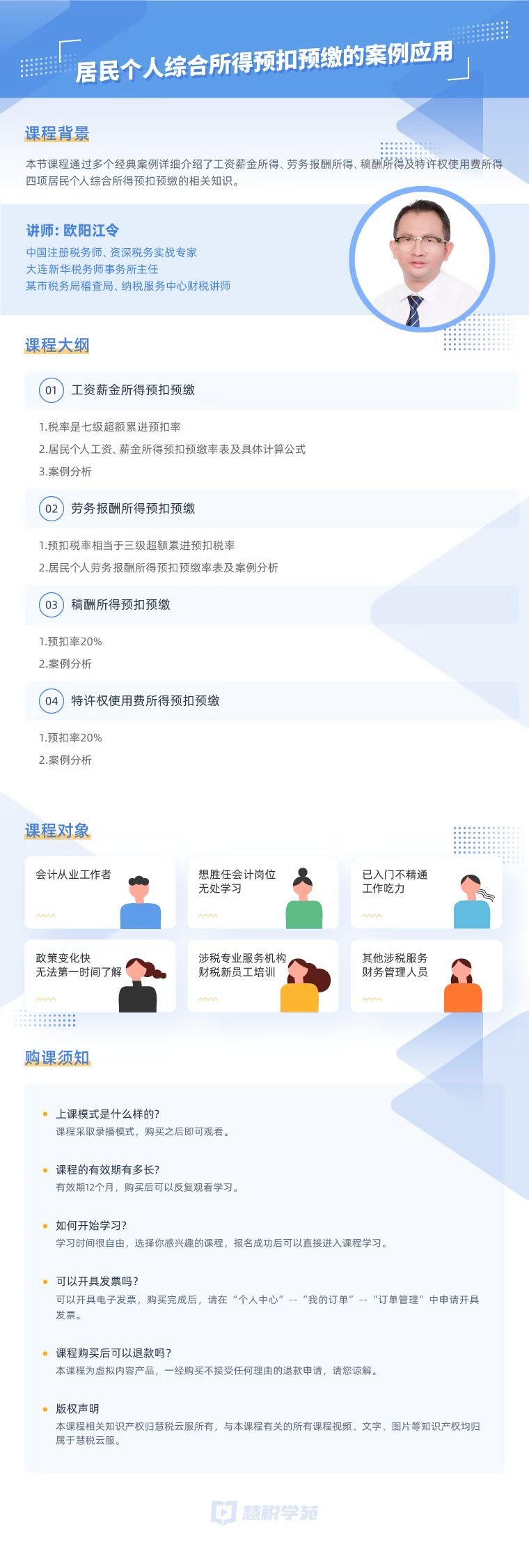 这节课专门为你详细介绍工资薪金所得、劳务报酬所得、稿酬所得及特许权使用费所得四大项居民个人所得预扣预缴相关知识!