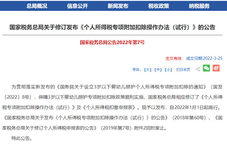 根据国税总局2022年初发布的《国家税务总局关于修订发布<个人所得税专项附加扣除操作办法(试行)>公告》中,我们可以得知从2022年1月1日起,个税专项附加扣除增加到7项了。