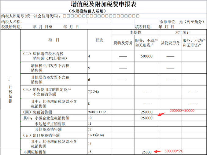 纳税申报:普票销售额=300000元,免税额=300000×3%=9000元;专票销售额(不含税)=50000元;征税额=50000×3%=1500元。
