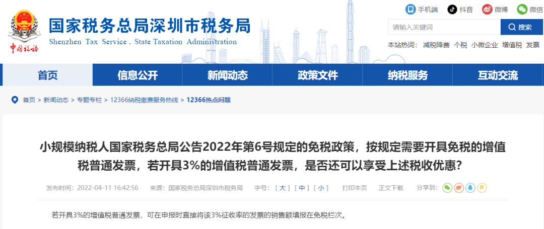 小规模开3%发票,申报能否享受免税?税务局最新答复:可以。一起来看下吧~