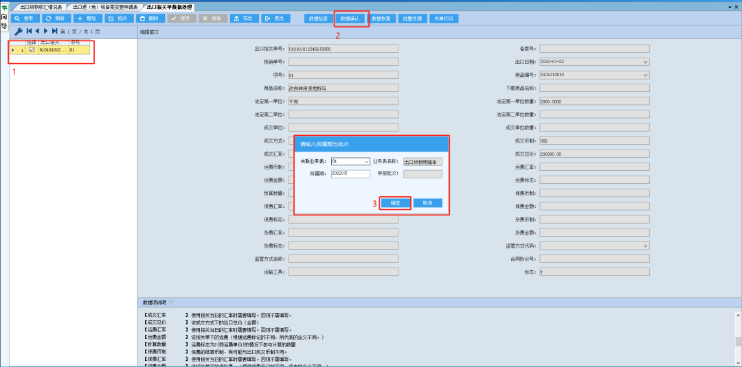 数据检查通过后,点击“数据确认”按钮,输入正确的所属期。确定后,输入出口发票号。