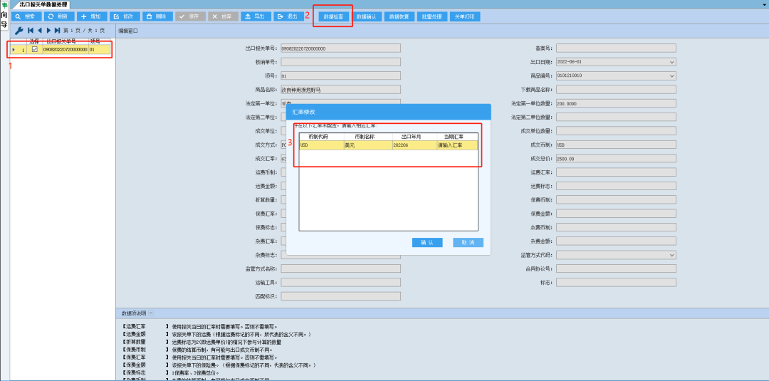 勾选需要申报的数据,点击“数据检查”按钮,系统弹窗提示“存在以下汇率为配置,请输入相应汇率”,需手工输入汇率。