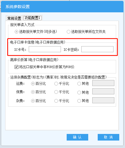 报关单数据在读入前,要检查当前计算机已有效连接电子口岸卡设备,并且配置的电子口岸卡信息与连接的电子口岸卡设备相符,需要在出口退税申报软件中的“系统维护”——“系统配置”——“系统参数设置与修改”——“功能配置I”中进行“IC卡号”和“IC卡密码”的配置。