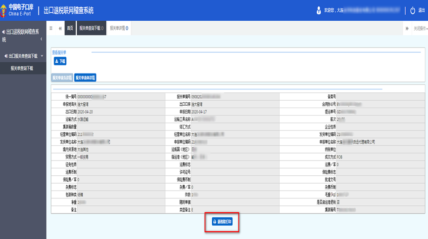 登录后,点击报关单查询下载,查询时可以按报关单号查询,也可以按照出口日期进行查询,按照出口日期查询时,出口日期可以设定区间为一个月内。查询后可以进行报关单的下载及打印。