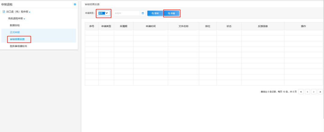 【注意】如果是首次使用离线版出口退税申报软件,需要同步已经审核通过的历史数据,可以通过登录电子税务局,在出口退税管理模块,进入离线版退税,选择“审核结果反馈”,将申请类型改为“年”,然后点击申请,进行反馈数据的下载。生产企业一般建议至少下载近2年的数据。