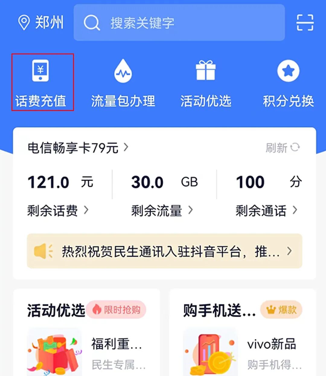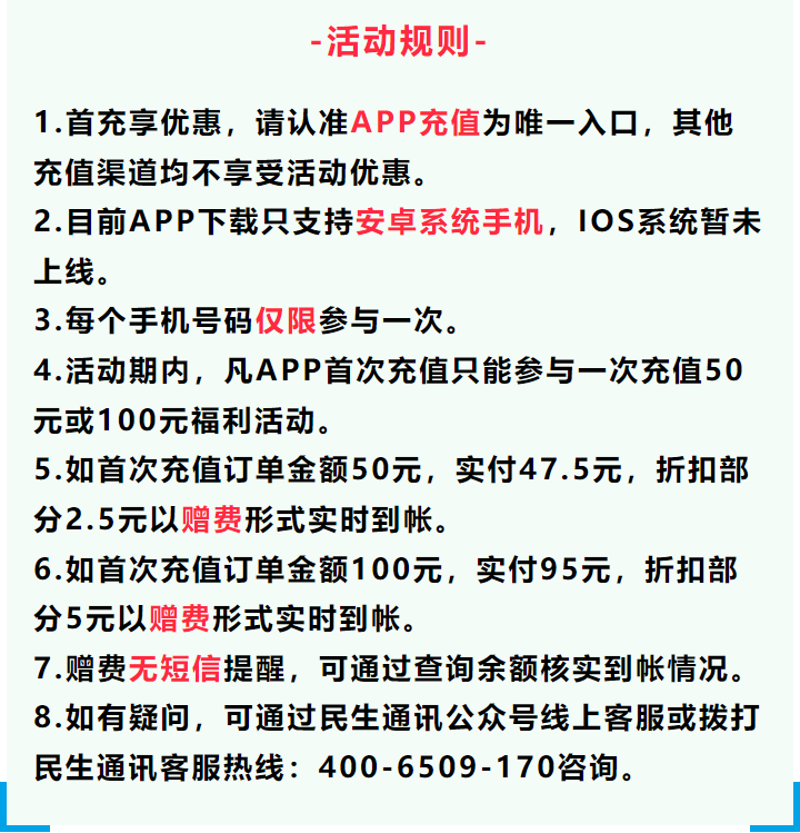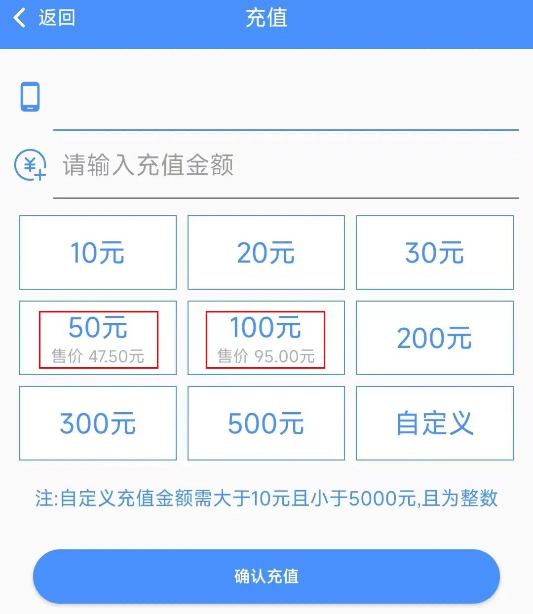 输入需要充值的民生通讯手机号码,选择充值100元或50元。