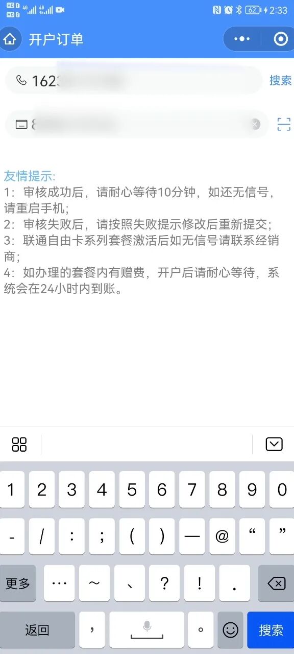 打开“民生通讯”公众号——点击“自助激活”——点击“卡号激活进度查询”。