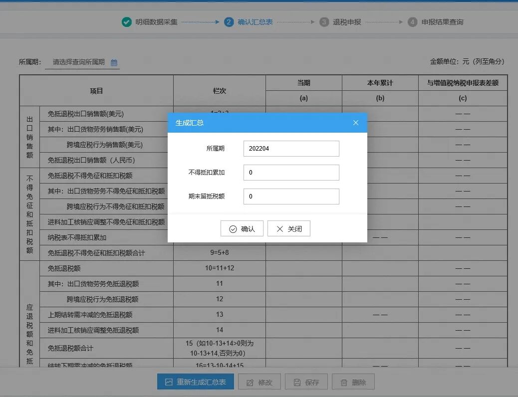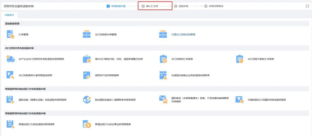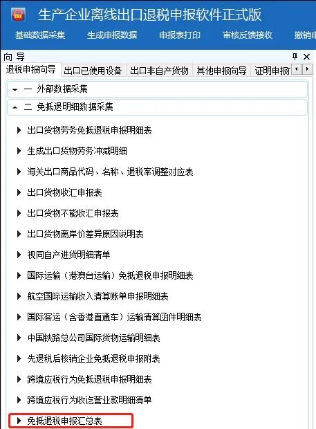 首先,点击退税申报向导中的第二步“免抵退明细数据采集”,选择“免抵退税申报汇总表”。