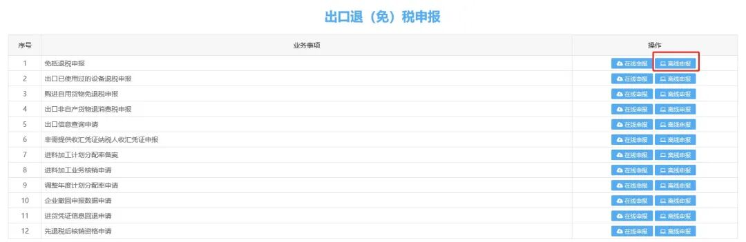 确认后,我们将生成的申报数据上传:登录电子税务局——出口退税管理模块,在出口退(免)税申报的“免抵退税申报”中,点击“离线申报”,进行数据的上传。
