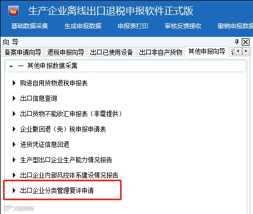 具体的复评申请,出口企业可在“其他申报向导”,点击“出口企业分类管理复评申请”,进行申报。(图片以生产企业离线版申报软件为例)