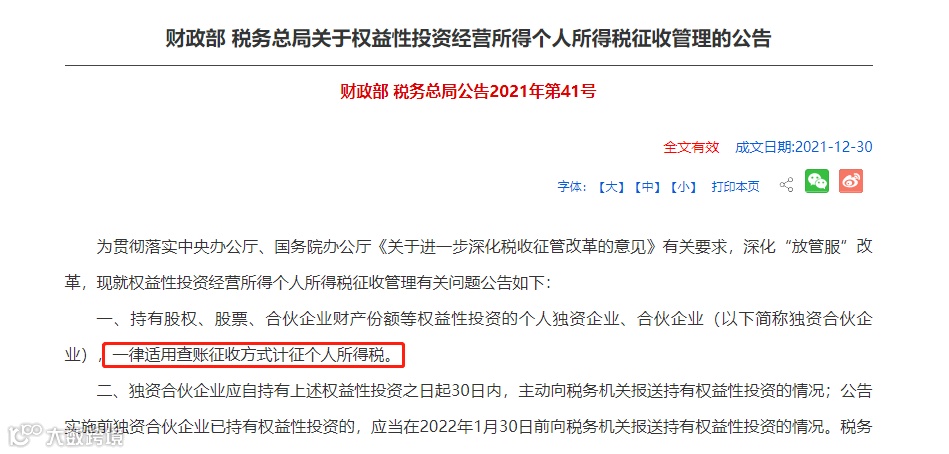 去年12月份税务总局发布《关于权益性投资经营所得个人所得税征收管理的公告》明确:持有股权、股票、合伙企业财产份额等权益性投资的个人独资企业、合伙企业(以下简称独资合伙企业),一律适用查账征收方式计征个人所得税。