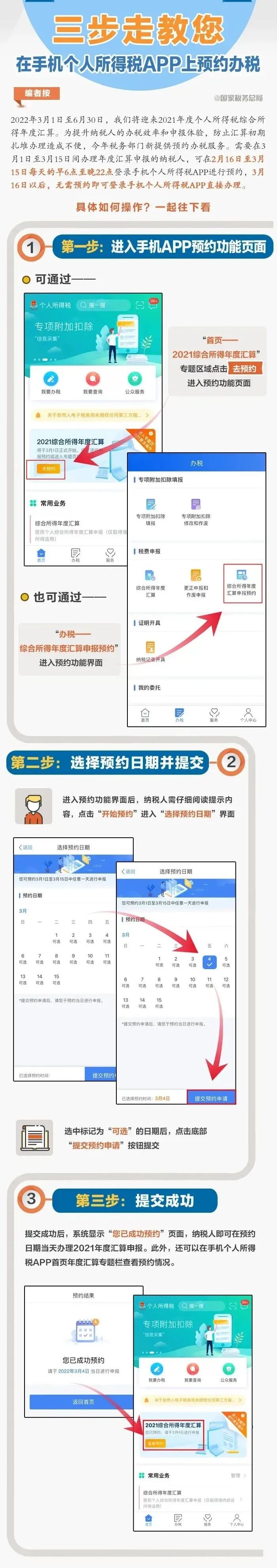 纳税人如需在3月1日至3月15日之间办理年度汇算,可在2月16日至3月15日每天的早6点至晚22点登录手机个人所得税APP进行预约。预约操作步骤非常简便,有关功能将于2月16日上线,届时我们将同步发布操作指南。