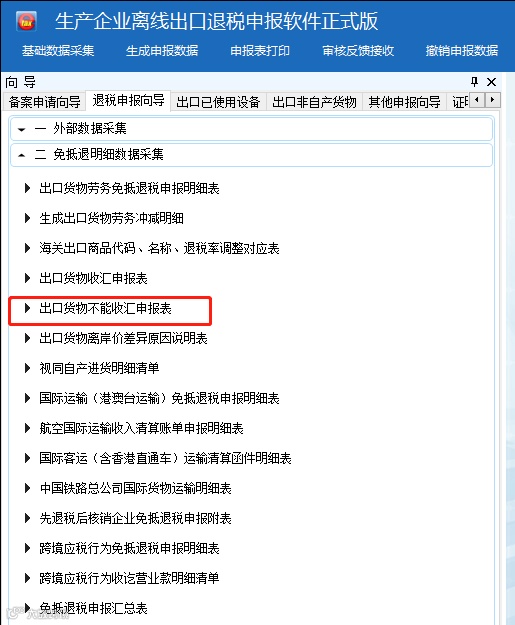 其次,如果是认定为收汇企业,比如分类管理类别为四类的,在申报时,数据的录入是在退税申报向导的数据采集中“出货物不能收汇申报录入表”中进行的。数据采集后则是需要连同出口的明细数据一起生成后进行申报。