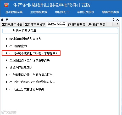 第一步,在其他申报向导的“其他申报数据采集”中进行数据的采集,选择“出口货物不能收汇申报表(非需提供)”。