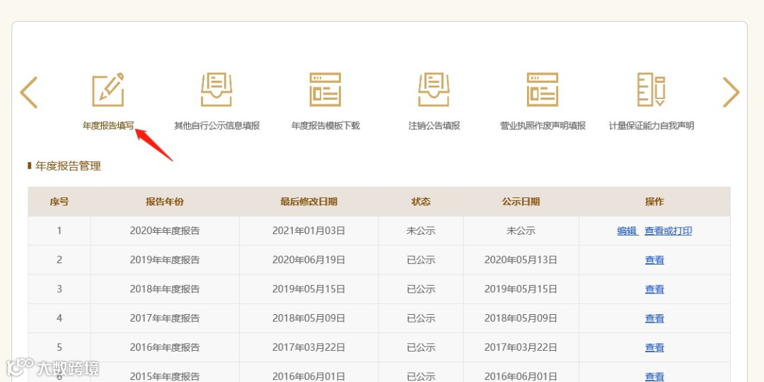 3、点击“年度报告填写”,了解须知并确认后,进入年度报告填写界面;