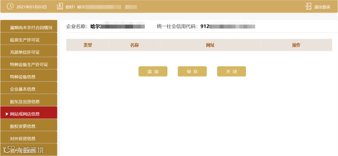 如果有网站或网店,就点击左边的“网站或网店信息”,点“添加”填写相关信息,如果没有网站或网店就不需要进行第五步的操作。
