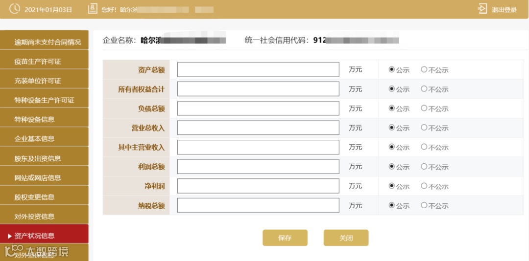 七、填写资产状况信息。填写营业额(年收入)、纳税总额。