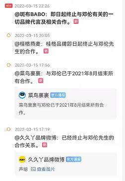 随后,各品牌纷纷发布消息,终止与邓伦的品牌合作……