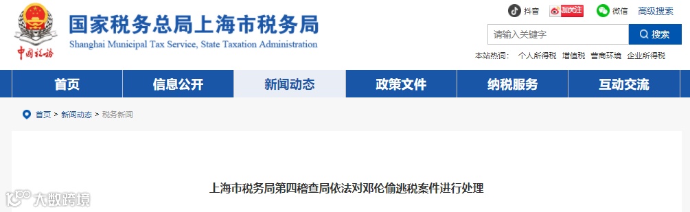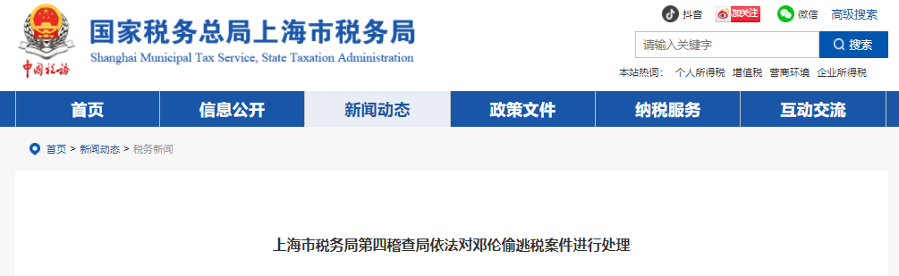 昨天,上海市税务局发布最新公告:近期,根据税收监管中的线索,第四稽查局经税收大数据进一步分析,发现邓伦涉嫌偷逃税款,依法对其开展了全面深入的税务检查。