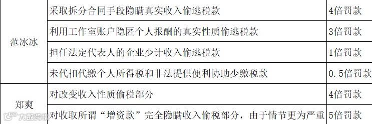 对之前范冰冰、郑爽的处罚也是一样,税务机关考虑主观故意、不同的违法行为、情节严重等分别处于0.5倍-5倍罚款。
