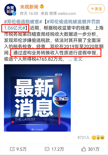 昨天,邓伦因偷逃税被处罚的消息瞬间冲上热搜第一,被追缴并罚款高达1.06亿元!