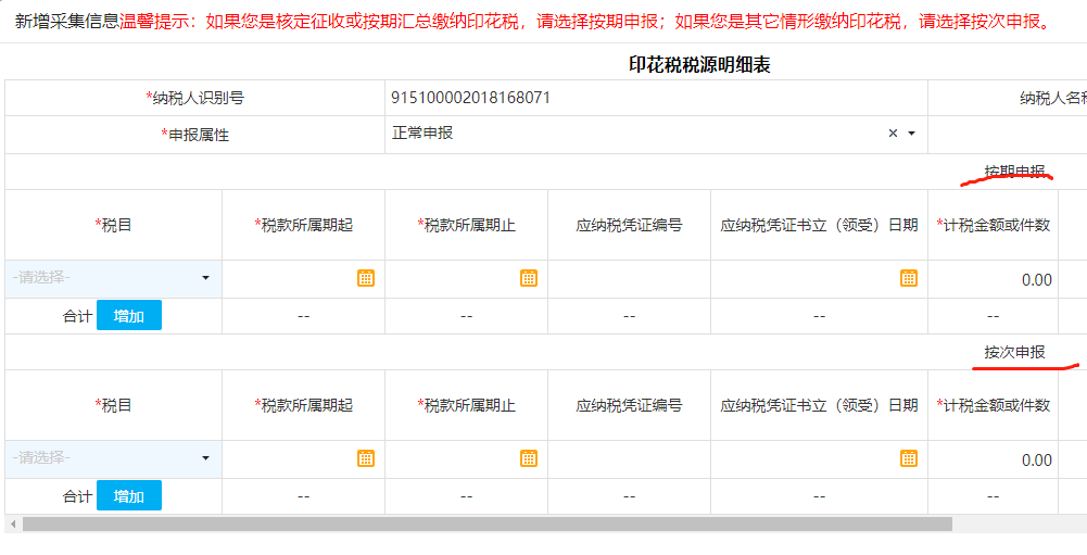 按期(月)申报印花税的,进入税源采集界面, “纳税期限”会带出“按月”选项。录入税款所属期,系统会显示当期应申报的征收品目(税目),默认计税依据为零,点击保存-确认后即可跳转申报。