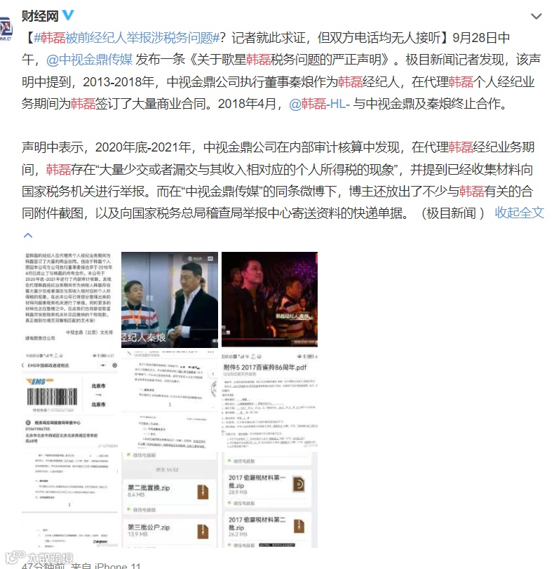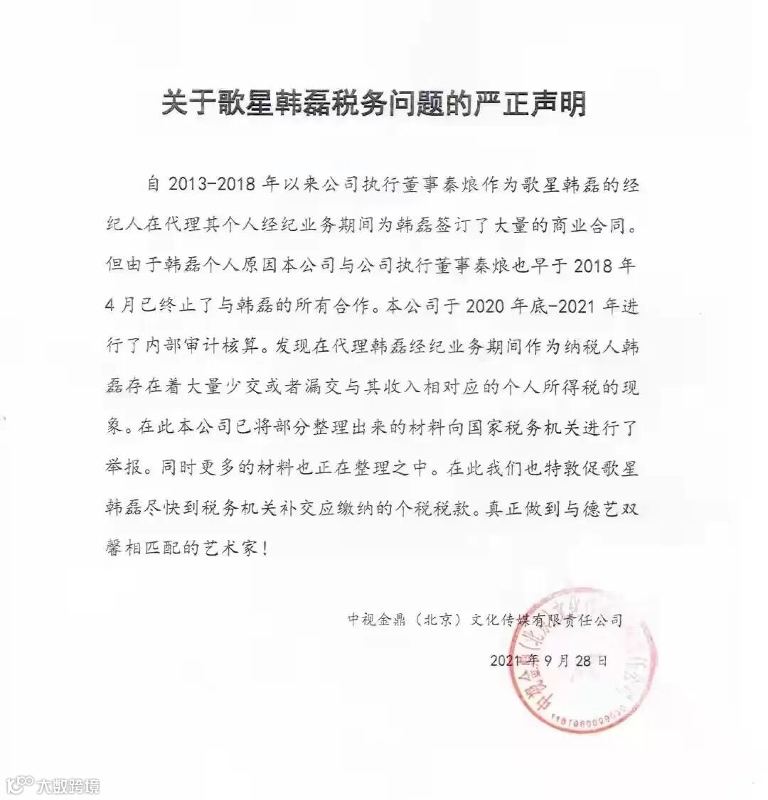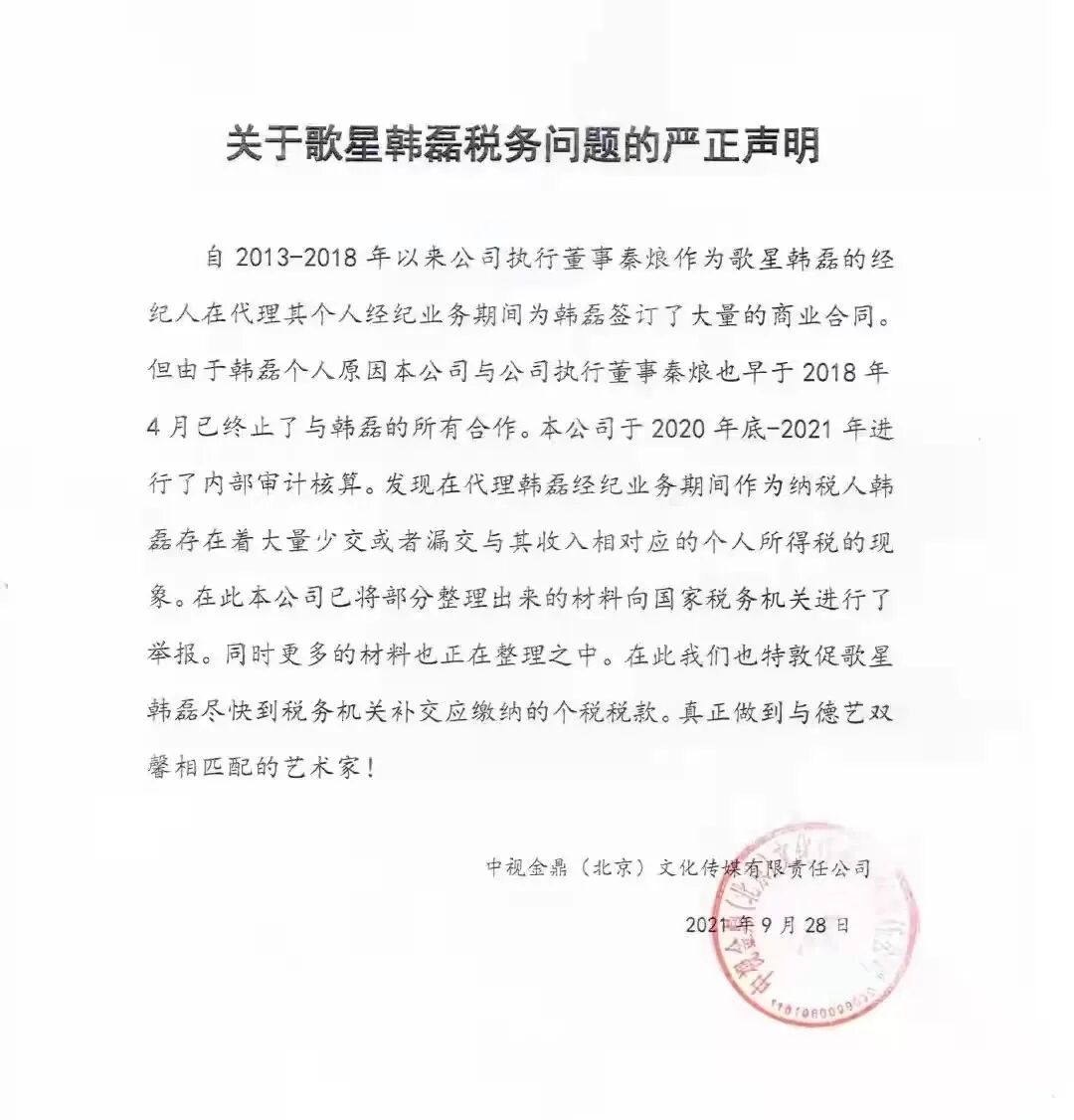 9月28日,中视金鼎(北京)文化传媒有限责任公司在社交媒体发布声明称,发现公司在代理著名歌手韩磊经纪业务期间,韩磊存在着大量少交或者漏交与其收入相对应的个人所得税的现象。敦促歌星韩磊尽快到税务机关补交应缴纳的个税税款。并放出了不少与韩磊有关的合同附件截图,以及向国家税务总局稽查局举报中心寄送资料的快递单据。