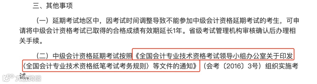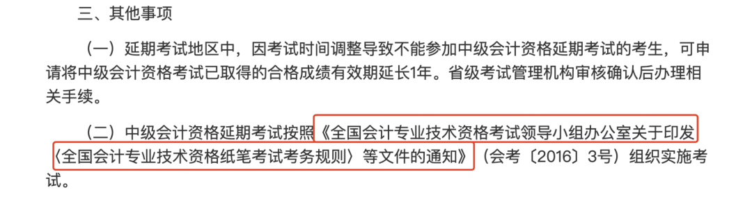 (二)中级会计资格延期考试按照《全国会计专业技术资格考试领导小组办公室关于印发〈全国会计专业技术资格纸笔考试考务规则〉等文件的通知》(会考〔2016〕3号)组织实施考试。