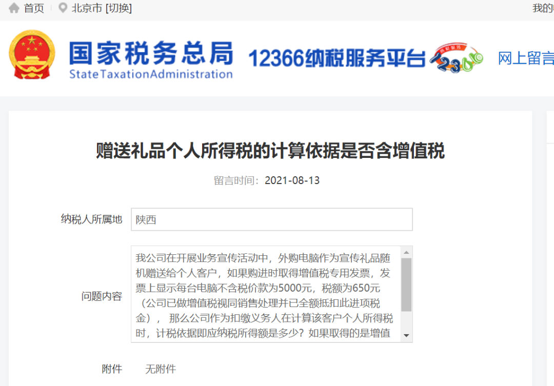 贵州省国家税务局12366呼叫中心答复:根据《国家税务总局关于企业促销展业赠送礼品有关个人所得税问题的通知》(财税〔2011〕50号):“三、企业赠送的礼品是自产产品(服务)的,按该产品(服务)的市场销售价格确定个人的应税所得;是外购商品(服务)的,按该商品(服务)的实际购置价格确定个人的应税所得。”