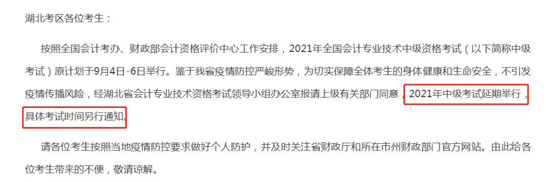 刚刚,湖北省财政厅发布《关于延期举行湖北省全国会计专业技术中级资格考试的公告》,原计划于9月4日-6日举行的2021年中级考试延期举行,具体考试时间另行通知。