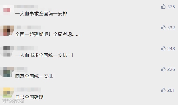 其中有考生认为,全国一块延期吧,这样公平公正。