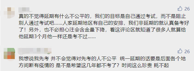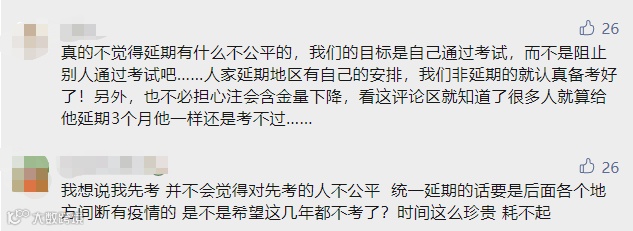 也有考生认为:真的不觉得延期有什么不公平的,我们的目标是自己通过考试,而不是阻止别人通过考试吧……人家延期地区有自己的安排,我们非延期的就认真备考好了!另外,也不必担心注会含金量下降,看这评论区就知道了很多人就算给他延期3个月他一样还是考不过……