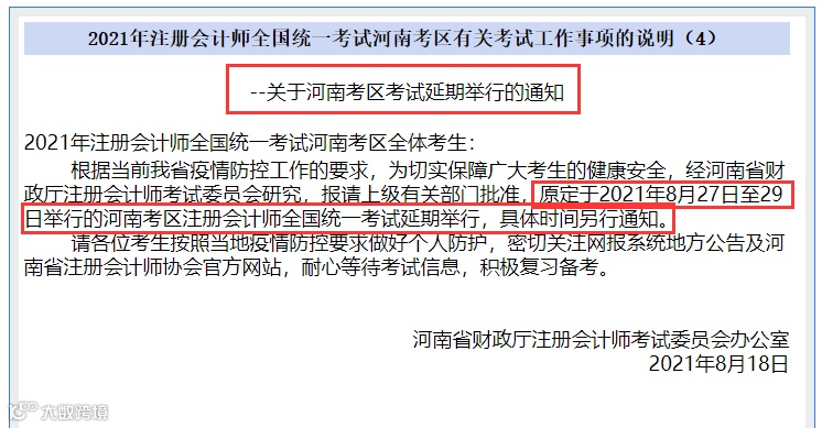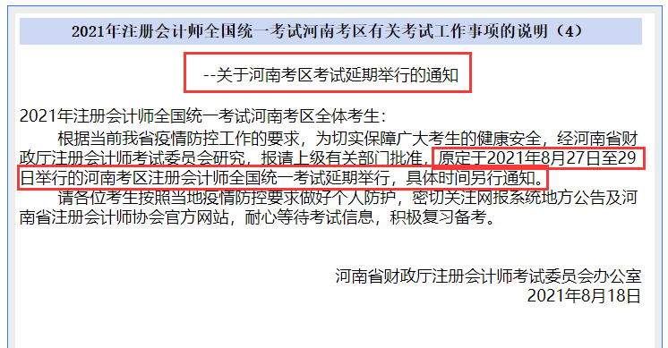 8月18日上午,河南省注册会计师协会发布《关于河南考区考试延期举行的通知》,河南考区2021注册会计师全国统一考试延期,具体时间另行通知。