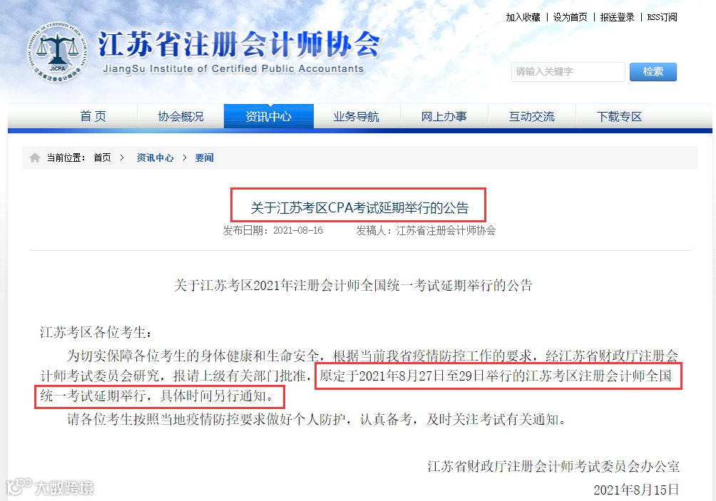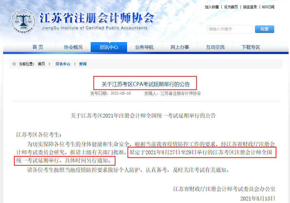 8月16日,江苏省注册会计师协会发布2021年注册会计师发布《关于江苏考区CPA考试延期举行的公告》,通告显示,因疫情影响,2021年江苏省市注册会计师考试延期,具体时间另行通知,后续相关事项,以官方通知为准。