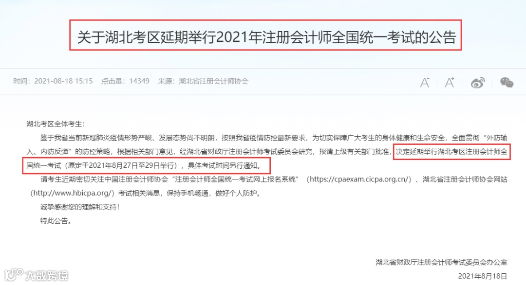 当天下午,湖北省注册会计师协会也发布《关于湖北考取延期举行2021年注册会计师全国统一考试的公告》,延期举行湖北考区注册会计师全国统一考试(原定于2021年8月27日至29日举行),具体考试时间另行通知。