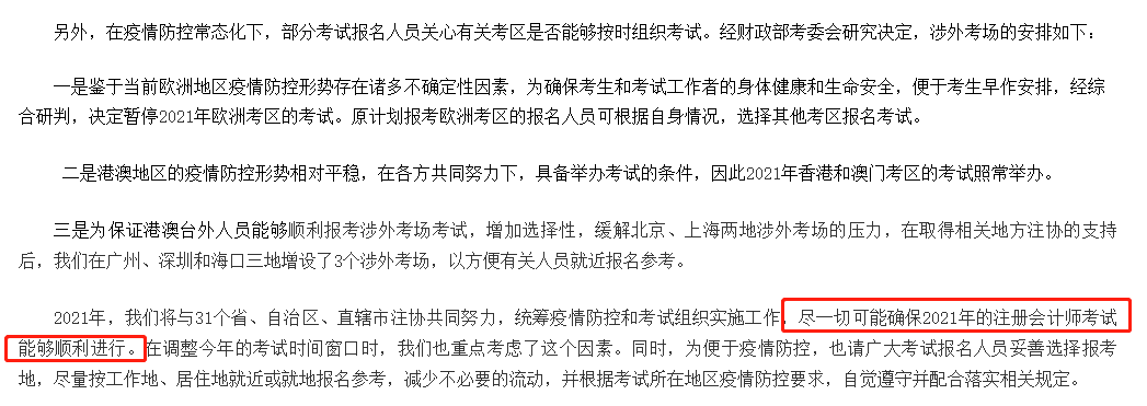 “2021年,我们将与31个省、自治区、直辖市注协共同努力,统筹疫情防控和考试组织实施工作,尽一切可能确保2021年的注册会计师考试能够顺利进行。在调整今年的考试时间窗口时,我们也重点考虑了这个因素。”