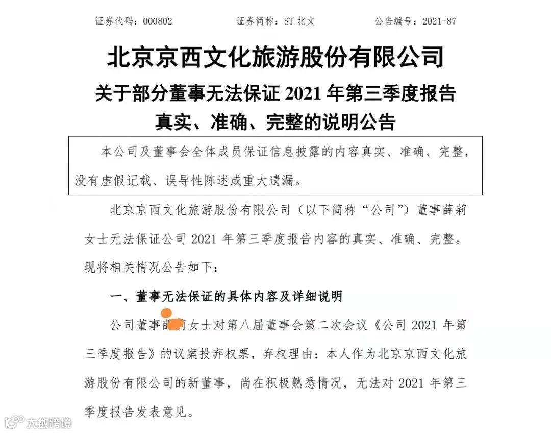 同时小编也注意到,在2021年10月29日,北京文化公布了《关于部分董事无法保证2021年第三季度报告真实、准确、完整的说明公告》,根据公告所述,公司董事薛女士对第八届董事会第二次会议《公司2021年第三季度报告》的议案投弃权票,弃权理由:“本人作为北京京西文化旅游股份有限公司的新董事,尚在积极熟悉情况,无法对2021年第三季度报告发表意见。”