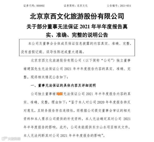 此外,在2021年8月25日,北京文化公布了《关于部分董事无法保证2021年半年度报告真实、准确、完整的说明公告》,根据公告所述,公司独立董事褚某无法保证公司2021年半年度报告内容的真实、准确、完整,理由如下:“鉴于本人对公司2020年年度报告持有反对意见,且财务报告存在连续性,而根据公司提交董事会审计的相关资料和本人要求公司提供的补充资料,本人无法确定其对公司2021年半年度报告的影响。此外,公司未能提供东方山水项目相关文件,本人无法判断其对公司2021年半年度报告的影响。”