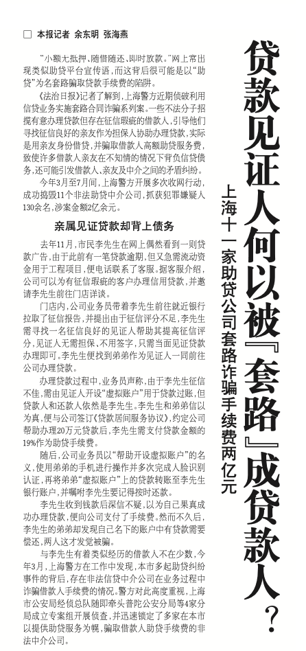 今年3月至7月间,上海警方开展波次收网行动,成功捣毁11个非法助贷中介公司。目前,该案8名主要犯罪嫌疑人已因涉嫌合同诈骗罪被警方依法移送检察机关审查起诉,其余犯罪嫌疑人已被依法采取刑事强制措施,案件正在进一步侦办中。