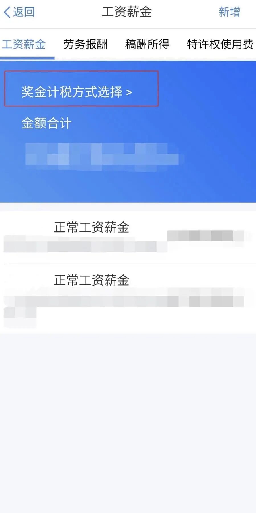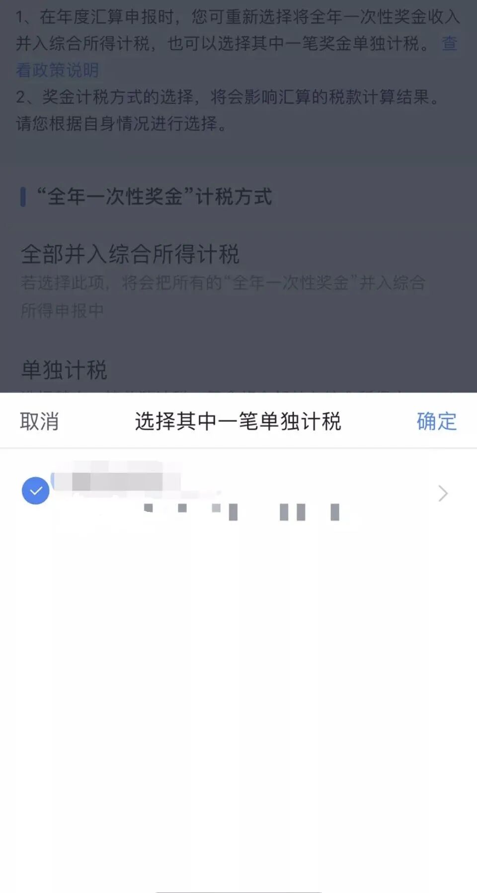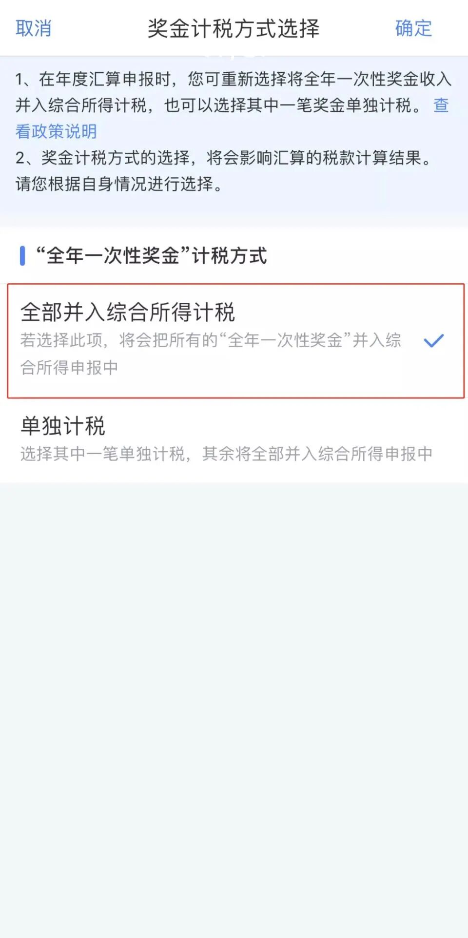 在收入的“工资薪金”栏有提示“存在奖金,请在详情中进行确认”,在“奖金计税方式选择”页面,可选择“单独计税”或“全部并入综合所得计税”。