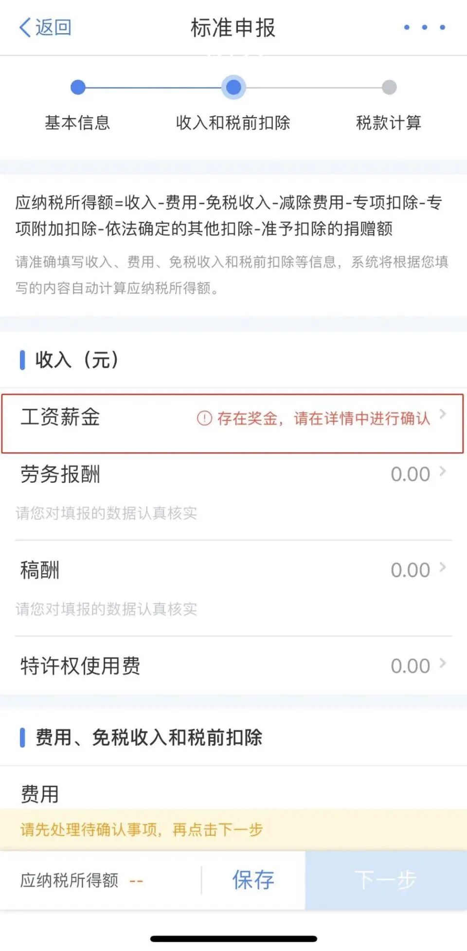 简单说,就是在收入的“工资薪金”栏有提示“存在奖金,请在详情中进行确认”,在里面选择合适的即可。你拿出手机,现在我们就来操作吧!
