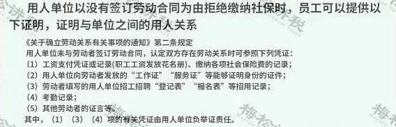 实务中,有些用人单位会以没有签订劳动合同为由拒绝为职工缴纳社保,岂不知,劳动关系的确定可不仅仅取决于一纸合同,只要有充分的证据证明个人与单位之间存在劳动关系,社保就必须得交~